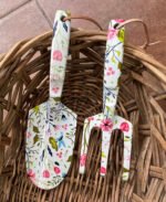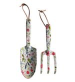 A set of aluminum gardening tools imprinted with Womanswork’s exclusive Garden of Paradise design.